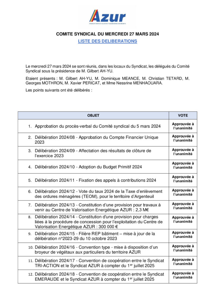 Liste délibérations 27/03/2024