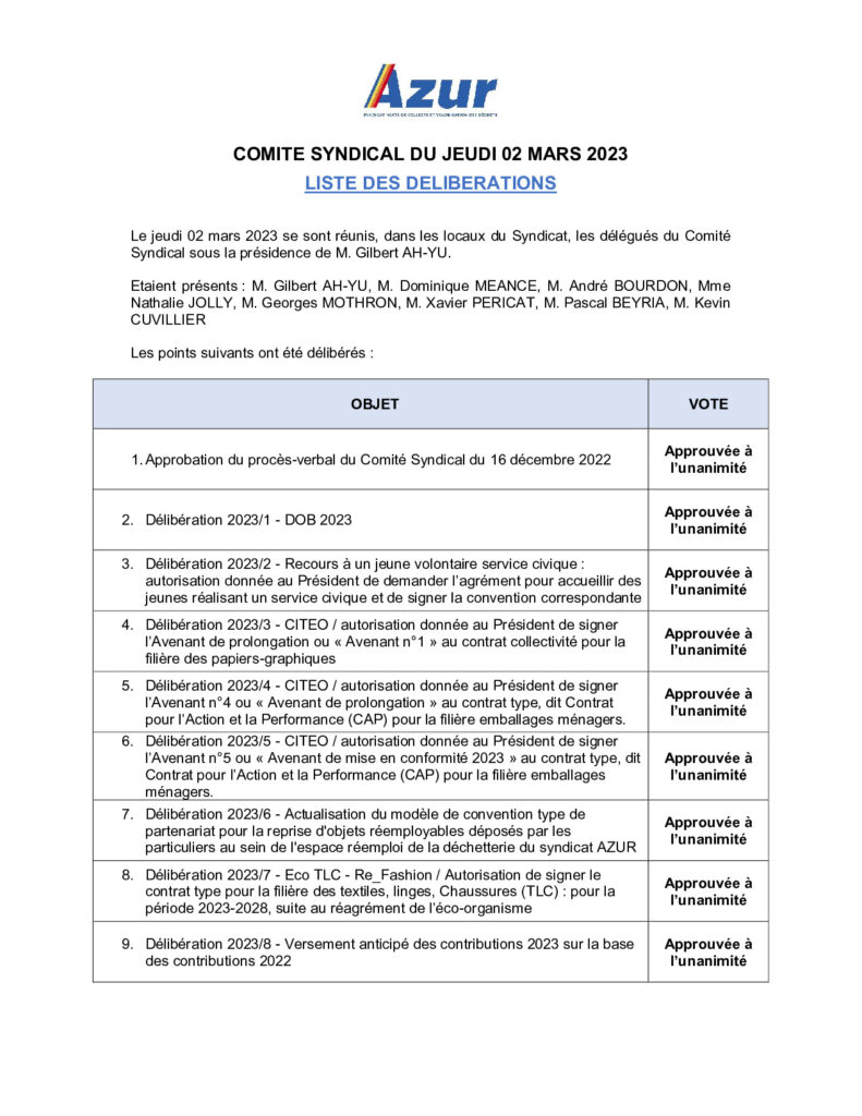 Liste délibérations du 02/03/23